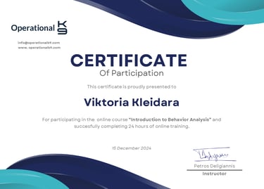 Εξειδίκευση στη συμπεριφορά και την ευζωία των ζώων, με έμφαση στις ανάγκες και την ποιότητα ζωής τους.Introduction to Behavior Analysis – Operational K9