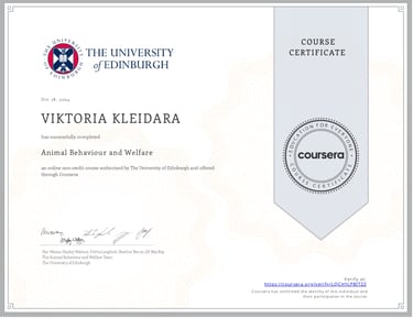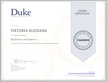 Κατανόηση της γνωστικής και συναισθηματικής ανάπτυξης των σκύλων, με στόχο τη βαθύτερη επικοινωνία με τα ζώα.Animal Behaviour and Welfare – University of Edinburgh (Coursera)